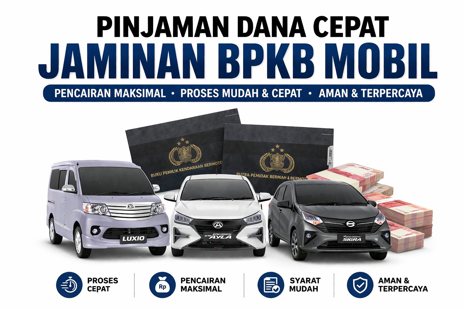 Ajukan pinjaman dana tunai dengan jaminan BPKB mobil secara mudah dan cepat. Cukup siapkan 4 dokumen utama: KTP, KK, STNK, dan BPKB asli. Proses transparan, aman, dan ditangani oleh tim profesional.